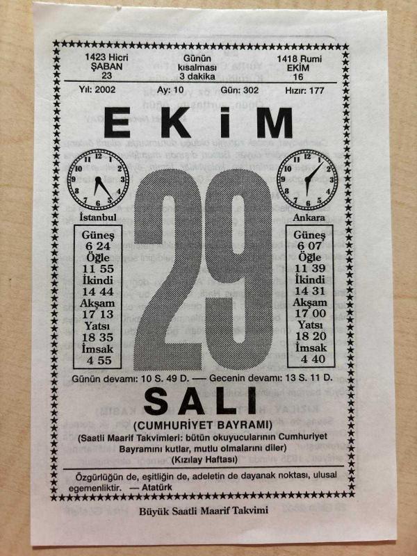 5 EKİM 2002 - TAKVİM YAPRAĞI - DOĞUM GÜNÜ HEDİYESİ - BÜYÜK SAATLİ MAARİF TAKVİMİ - HZ.MUHAMMED - GAZİ MUSTAFA KEMAL ATATÜRK - MEHMET EMİN YURDAKUL - DR. OSMAN NEBİOĞLU - İLK CUMHURİYET ALTINI BASILDI - KAYSERİ'DE İLK UÇAK FABRİKASI DEVREYE GİRDİ