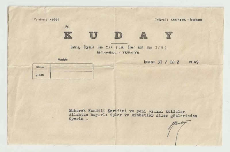 31 ARALIK 1949 KUDAY FİRMASINDAN BİR YENİ YIL TEBRİK YAZISI...