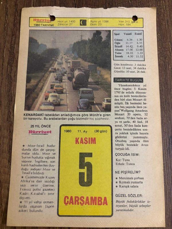 29 KASIM 1980 - TAKVİM YAPRAĞI - DOĞUM GÜNÜ HEDİYESİ - HÜRRİYET TAKVİMİ - ESKİ BİR ŞARKI ADLI ROMAN - Tango bestecisi Necip Celâl Antel'in ölümü (1958) - Şişe ve Cam Fabrikası'nın açılışı (1935) - İstiklâl Madalyası Kanununun kabulü (1920) - Besteci Hamamizade İsmail Dede Efendi'nin ölümü