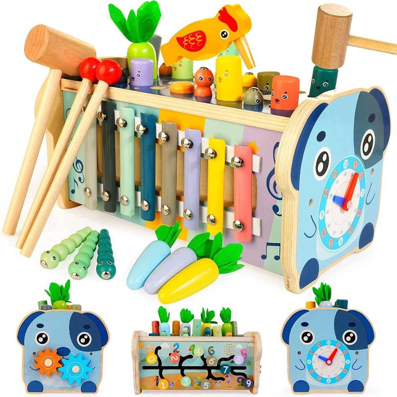 7-in-1 Montessori Wooden Toys for Toddlers Age 1 2 3, Hammering Pounding Toy with Whack a Mole Game, Carrot Harvest, Xylophone, Number Maze, Clock, Gears, Woodpecker, Gift for 12+ Month Babies