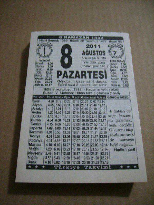 8 ağustos 2011 takvim yaprağı (türkiye takvimi)