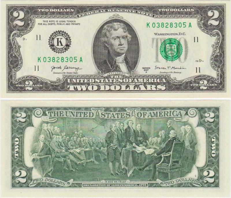 AMERİKA BİRLEŞİK DEVLETLERİ 2 DOLAR 2017 A DALLAS TEKSAS. SERİ NO. K 03828390 A OLACAKTIR. ÇİL KONDİSYON.