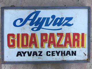 AYVAZ GIDA PAZARI BAKKAL TABELASI TENEKE CİFT TARAFLI EL CİZİM AYVAZ CEYHAN