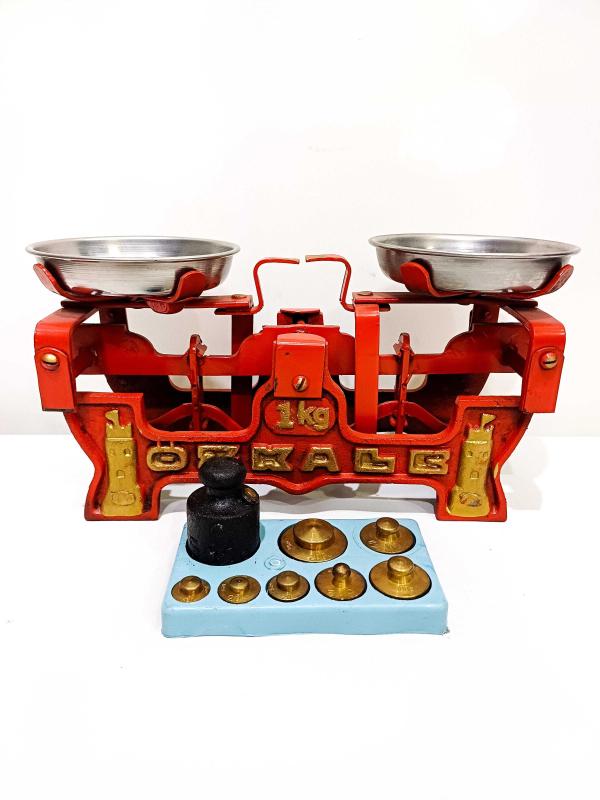 Antika Çil Kondüsyonda Öz Kale 1 Kg'lık Pirinç Ağırlıklı Kefeli Terazi