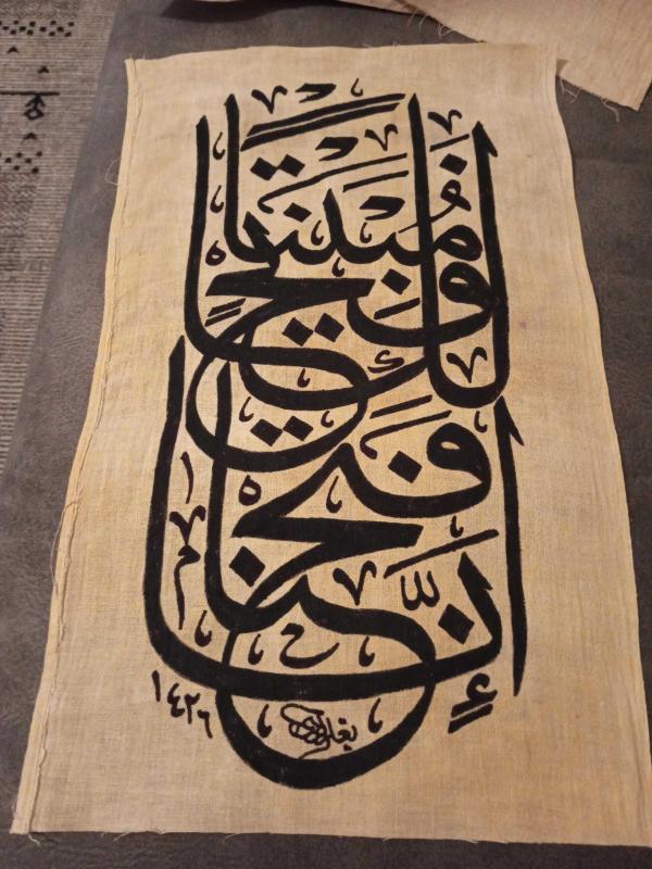 Arapça Kaligrafi Sanatı Fetih suresi: inna fetahna leke fethan mubina. 30*50 el çekme