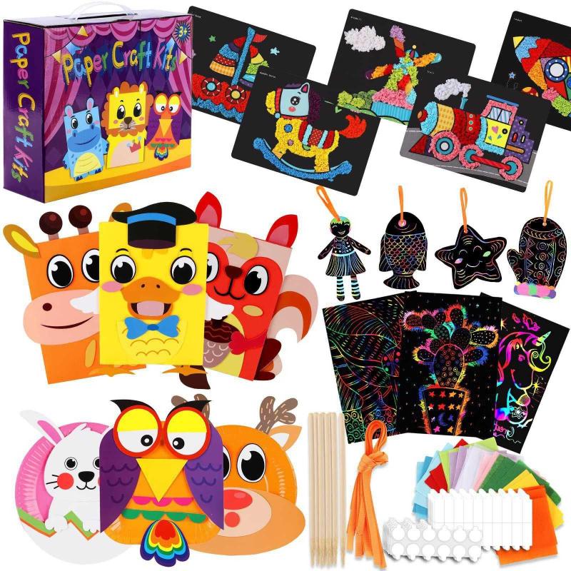 【35 All-Inclusive Fun Craft Box】This arts and crafts for kids comes with 35 projects for kids to make and create, including 5 animal paper plates, 5 paper bag puppets, 5 tissue paper crafts and 20 pcs rainbow scratch art. Suitable for ages 3 and up and that most children over the age of 5 can do with minimal to no help.