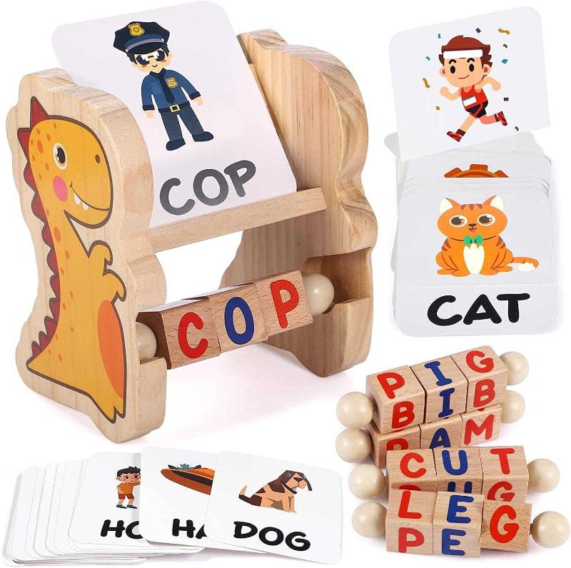 【MULTIPLE WAYS TO PLAY】--You can put the word card in the gap of the wooden tray, let your kid spin the letter blocks to match the card. You can also fold the card to cover the word, see if your child can recognize the pattern spell out the corresponding words. Along with finger strength and grip, toddlers will learn about the world around them while playing.