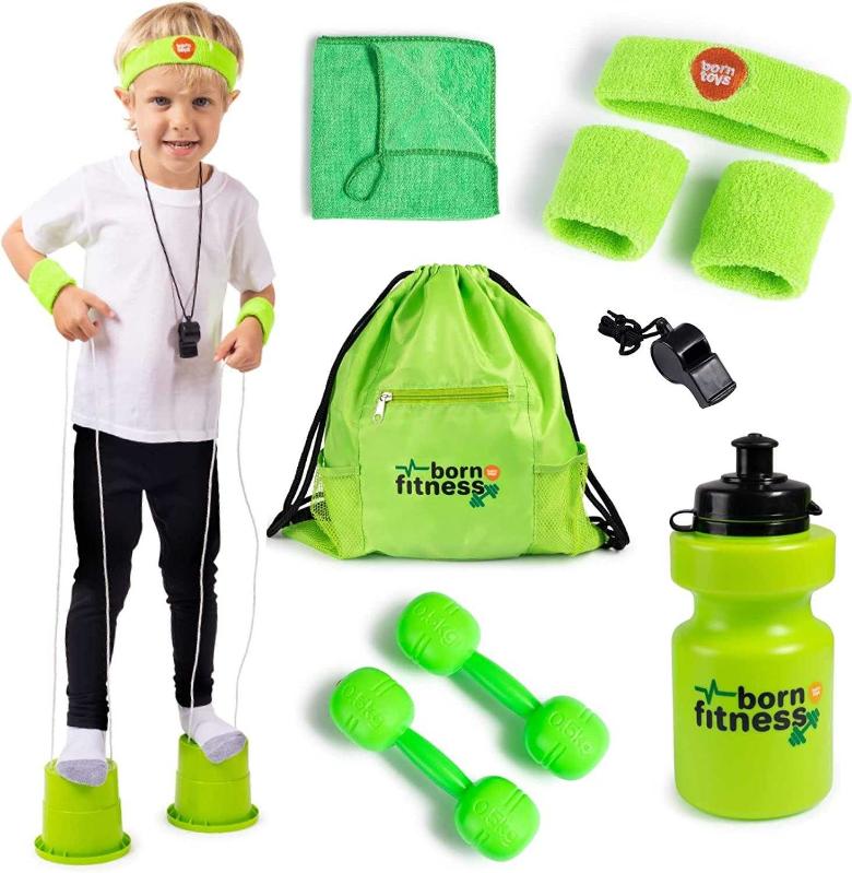 Born Toys 11pcs Kids Exercise Equipment Set for Kids Ages 3 & Up, Kids Workout Equipment Set Includes Kids Weights, Bucket Stilts, Kids Gym Bag, Sweat Bands, Gym Water Bottle, Toddler Workout Costume