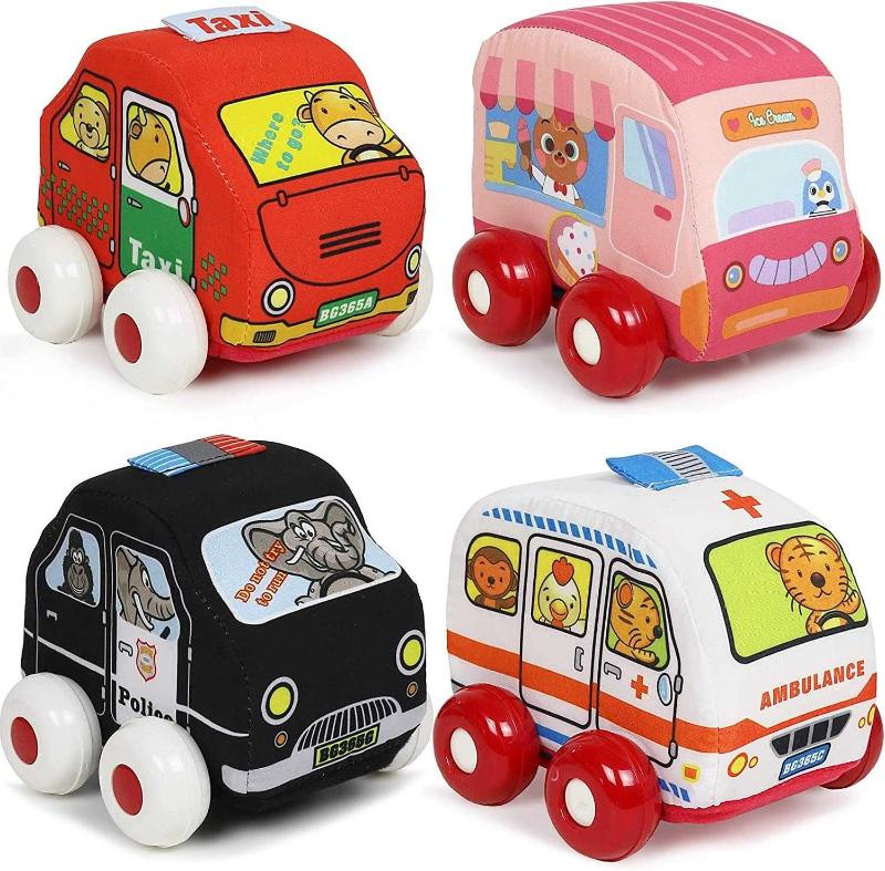 Super-Cute Plush Toys For Toddlers: Our toy cars set includes 4 soft toy cars, a police car, an ice cream truck, an ambulance, and a taxi, in vibrant colors that attract the children's attention and keep them happily busy for hours.