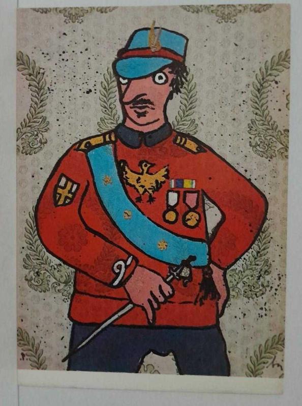 ENRICO BAJ TARAFINDAN ÇİZİLMİŞ ÜNİFORMA GİYMİŞ İNSAN RESMİ KARTPOSTALI,ARKASINA YAZILMAMIŞ,RENKLİ, 11 X 15 CM EBADINDA