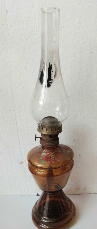GAZ LAMBASI, PAŞABAHÇE CAMLI, SORUNSUZ, KAHVERENGİ CAM HAZNE EL İŞÇİLİĞİ İLE ÇİÇEK MOTİFLERİ SÜSLENMİŞ, KULLANIMA VEYA DEKORLUK GAZ LAMBASI. 46 cm.BOYUNDA, 11 CM. ENİNDE..