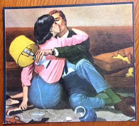 HEDİYE KARTPOSTALI, YERDE OTURUP BİRBİRİNE SARILMIŞ ŞEKİLDE ÖPÜŞEN ÇİFT ÇİZİMİ, SEVGİ DOLU ROMANTİK BİR KARE, ARKASI YAZILMAMIŞ, RENKLİ, 11 X 13 CM EBADINDA - 1940'LAR, 1950'LER, 1960'LAR, 1970'LER 1980'LER