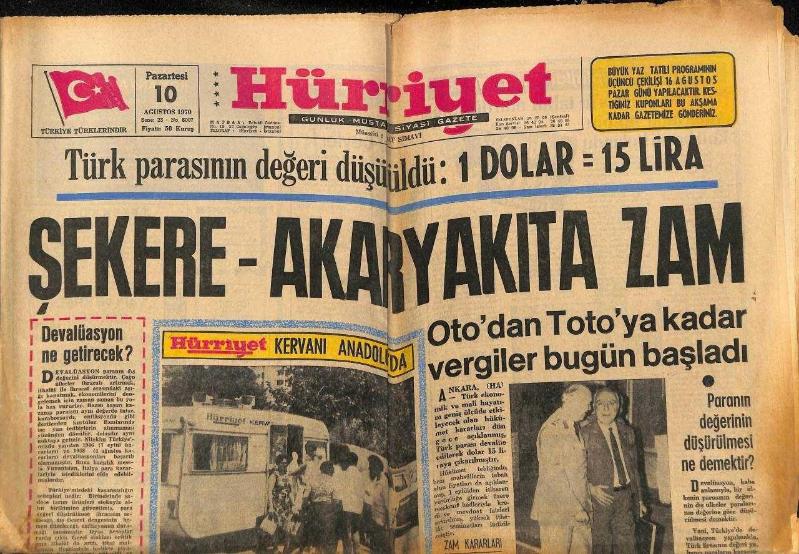 Hürriyet Gazetesi 10 Ağustos 1970 - Türk Parasının Değeri Düşürüldü : 1 Dolar = 15 Lira GZ77780