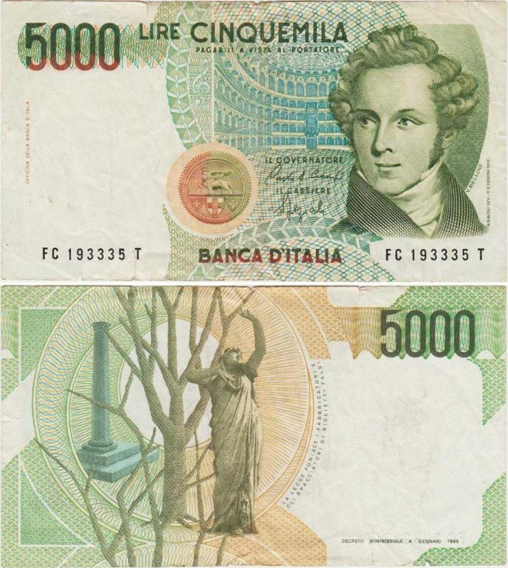 İTALYA 5000 LİRET 1985 BELLİNİ TEMALI. ALT KENARDAN 0,5 - ÜST KENARDAN 0,2 cm YIRTIK ÇOK TEMİZ+ KONDİSYON.