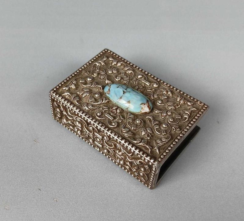 KİBRİTLİK 20 nci Yüzyıl Avrupa İmalatı, Harikulade Kabartma Detaylara Sahip, Firuze Taşlı, Gümüş Kaplama, Kibritlik..4 x 5,5 cm.