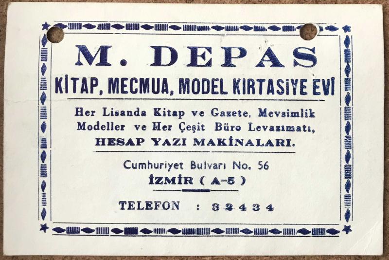M. Depas / Kitap, Mecmua, Model Kırtasiye Evi (İzmir) - Arkası Yazılı Kartvizit