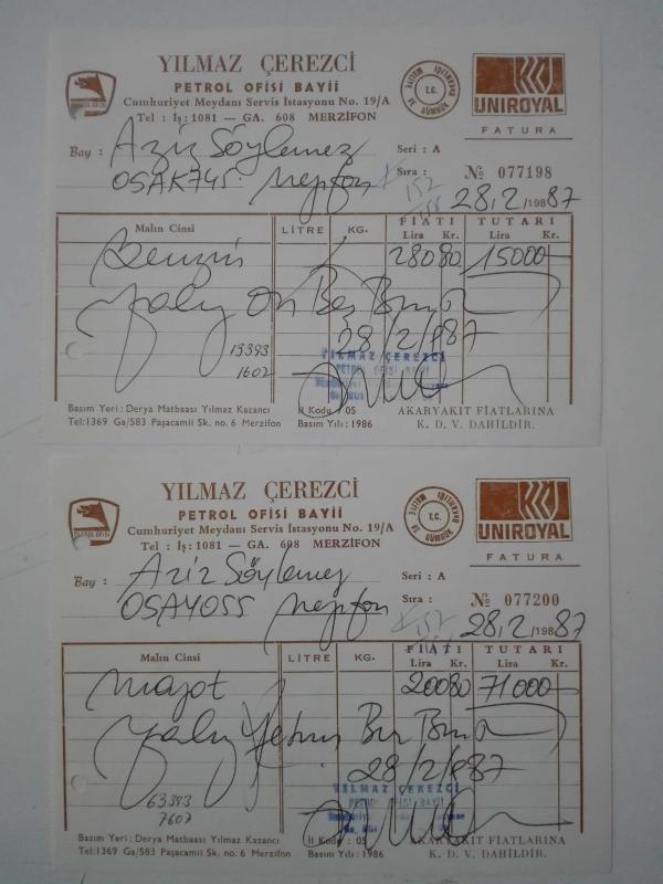 Merzifon YILMAZ ÇEREZCİ Petrol Ofisi ( UNIROYAL ) Bayii, 1987 Yılı, 2 Adet FATURA ( Aziz Söylemez adına düzenlenmiş )