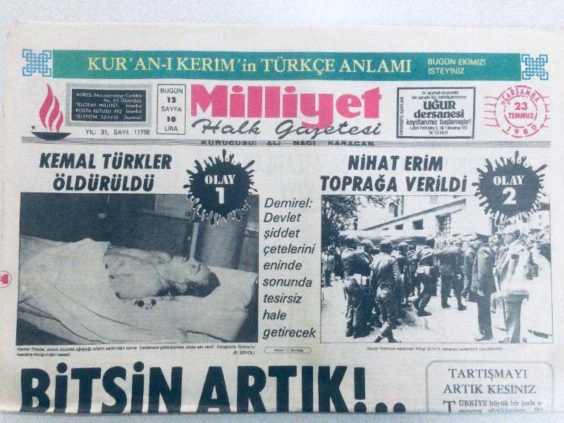 Milliyet Gazetesi 23 Temmuz 1980 - Kemal Türkler Öldürüldü, Nihat Erim Toprağa Verildi GZ40303
