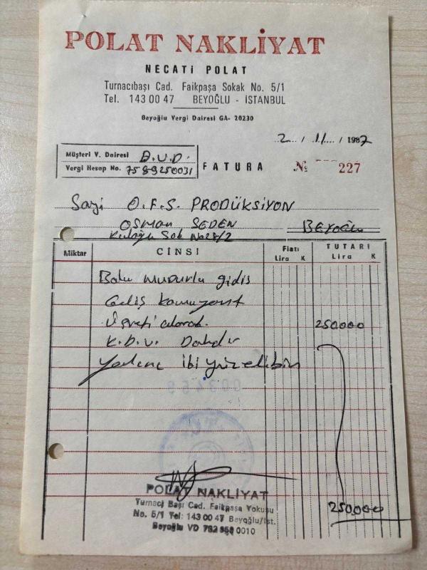 NAKLİYE FATURASI - 2 EKİM 1987 - POLAT NAKLİYAT - NECATİ POLAT - BOLU - OSMAN F. SEDEN - BEYOĞLU, İSTANBUL - ISLAK İMZALI, KAŞELİ - 14 x 21 cm EBATLI ORİJİNAL FATURA