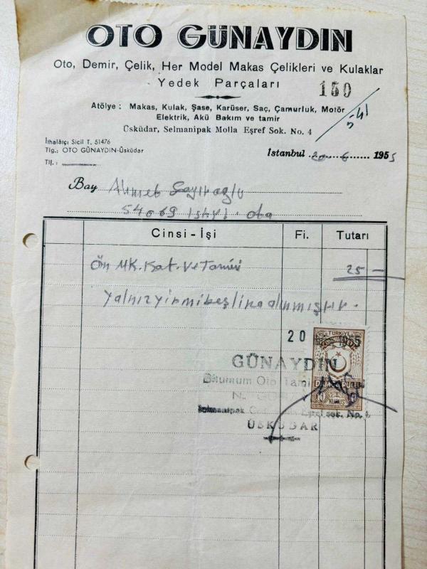 OTOMOBİL TAMİR FATURASI - 20 HAZİRAN 1955 - OTO GÜNAYDIN - OTO, DEMİR, ÇELİK, HER MODEL MAKAS ÇELİKLERİ VE KULAKLAR YEDEK PARÇALARI - ÜSKÜDAR, İSTANBUL- AHMET ÇAYIROĞLU - ISLAK İMZALI, KAŞELİ DAMGA PULU - 13 x 22 cm EBATLI ORİJİNAL FATURA