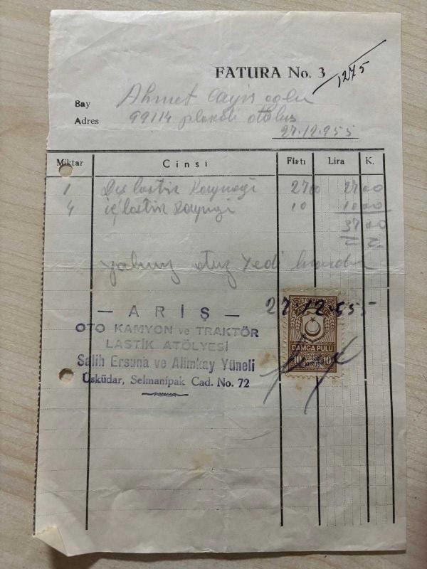 OTOMOBİL LASTİK TAMİRAT FATURASI - 24 ARALIK 1955 - ARİŞ - OTO KAMYON VE TRAKTÖR LASTİK ATOLYESİ - SALİH ERSUNA VE ALİMKAY YÜNELİ - ÜSKÜDAR, İSTANBUL- AHMET ÇAYIROĞLU - ISLAK İMZALI, KAŞELİ DAMGA PULU - 13 x 21 cm EBATLI ORİJİNAL FATURA