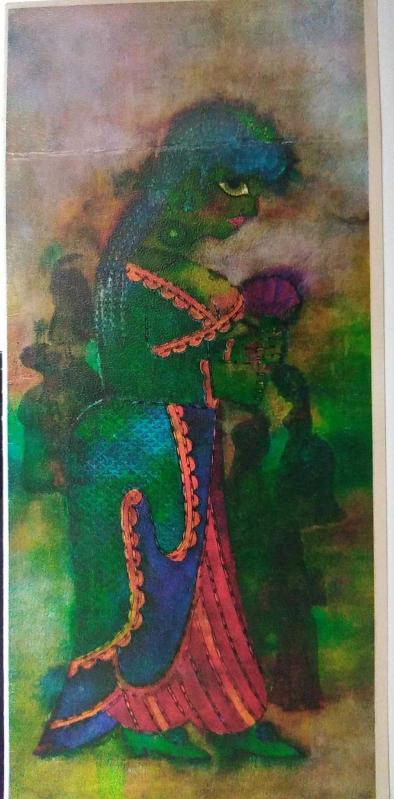 SANAT KARTPOSTALI-YURDAER ALTINTAŞ TARAFINDAN ÇİZİLMİŞ YEŞİLLER İÇİNDE KADIN RESMİ,İÇ KISMINA YAZILMAMIŞ,RENKLİ,KAPAKLI, 10 X 20 CM EBADINDA