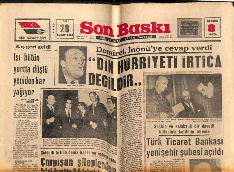 Son Baskı Gazetesi 20 Şubat 1968 - Türk Ticaret Bankası Yenişehir Şubesi Açıldı - Bütçe Görüşmesinde Spor Bakanlığı İstendi GZ148733