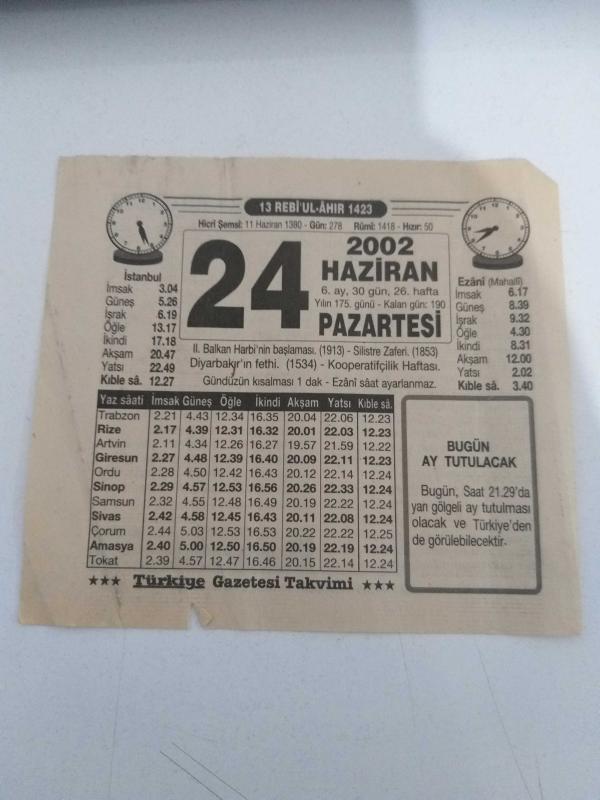 TÜRKİYE GAZETESİ TAKVİMİ / 24 Haziran 2002 Pazartesi TAKVİM YAPRAĞI - 11/10.5 cm.