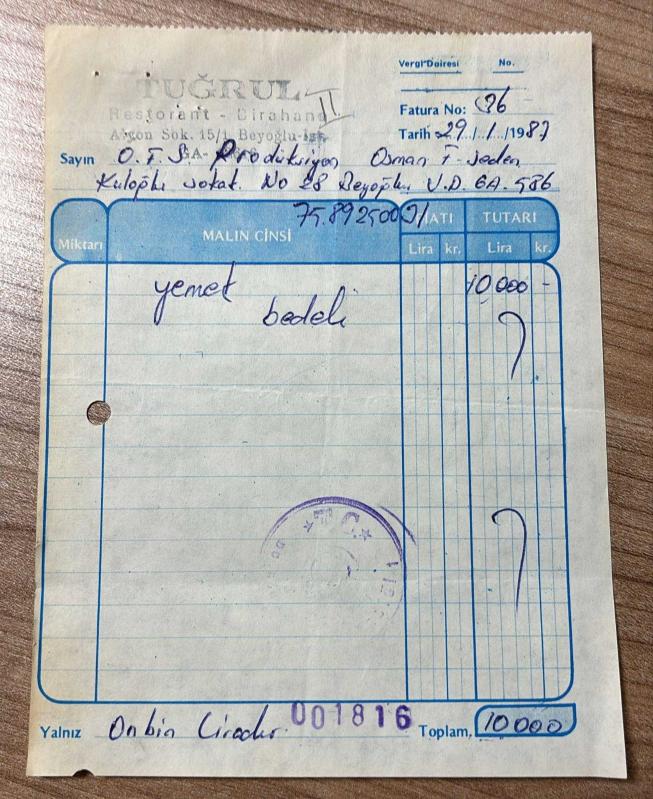 YEMEK FATURASI - 29 OCAK 1987 - TUĞRUL RESTAURANT-BİRAHANE - BEYOĞLU, İSTANBUL - OSMAN FAHİR SEDEN, O.F.S. PRODÜKSİYON - BEYOĞLU, İSTANBUL - ISLAK İMZALI, KAŞELİ - 13 x 17 cm EBATLI ORİJİNAL FATURA - TÜRK SİNEMA - FİLM TARİHİ