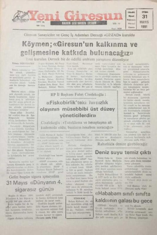 Yeni Giresun Gazetesi 31 Mayıs 1991 Giresun Sanayiciler Ve Genç İş Adamları Derneği Kuruldu GZ26026